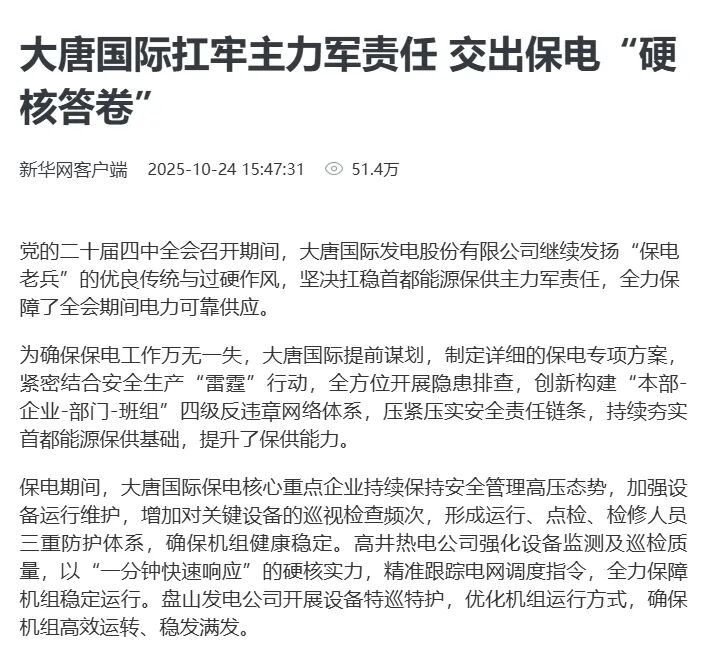 ]article_adlist-->10月24日,新华网客户端发表通讯报道《大唐国际扛牢主力军责任 交出保电“硬核答卷”》。